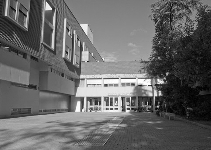 Por las 2 puertas laterales situadas en la entrada a la secretaria del colegio.